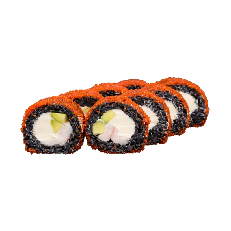 Креветка тигровая, авокадо, творожный сыр, рис чёрный, нори, икра тобико