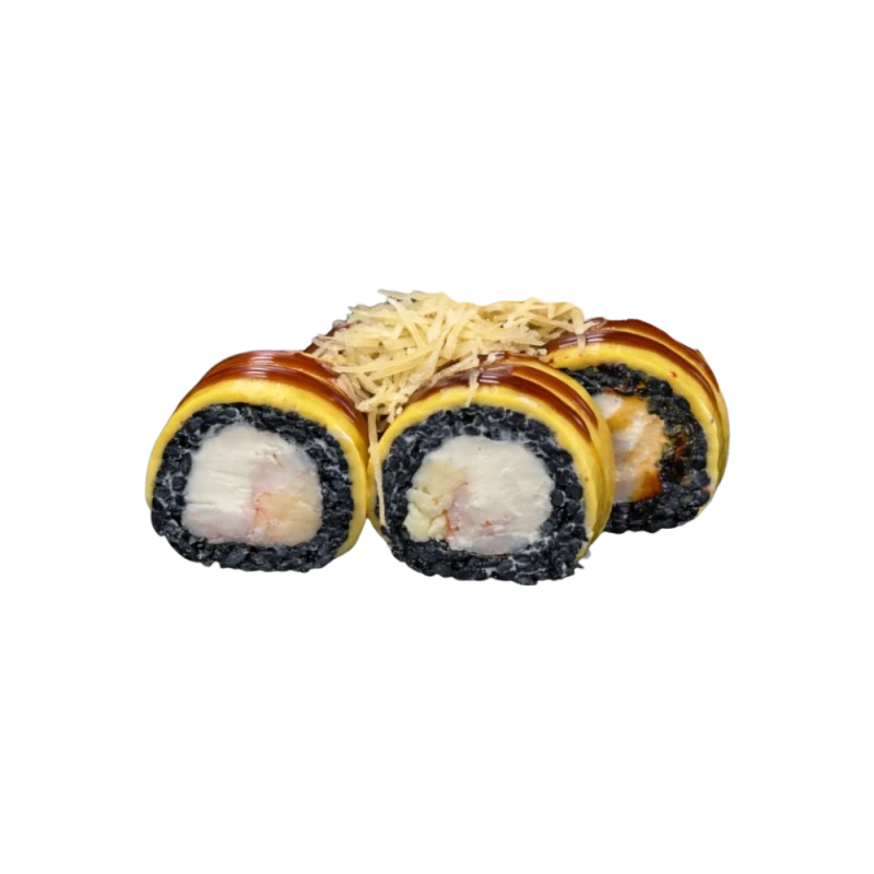 Креветка тигровая, сыр творожный, сыр моцарелла, сыр чеддер, сыр пармезан, соус Унаги, рис, нори